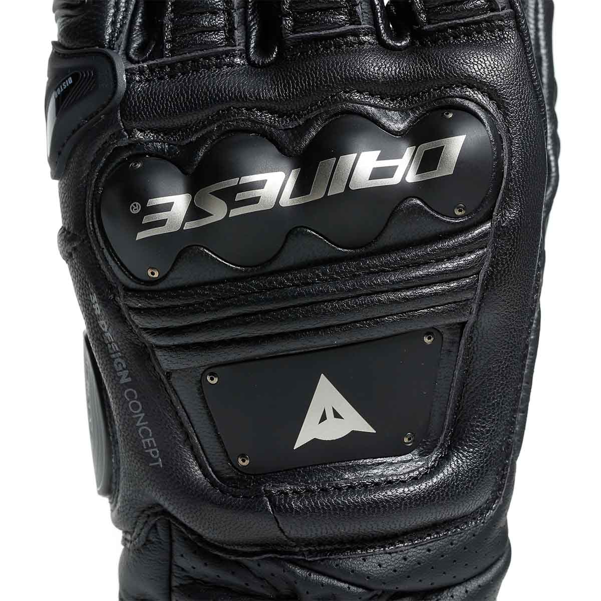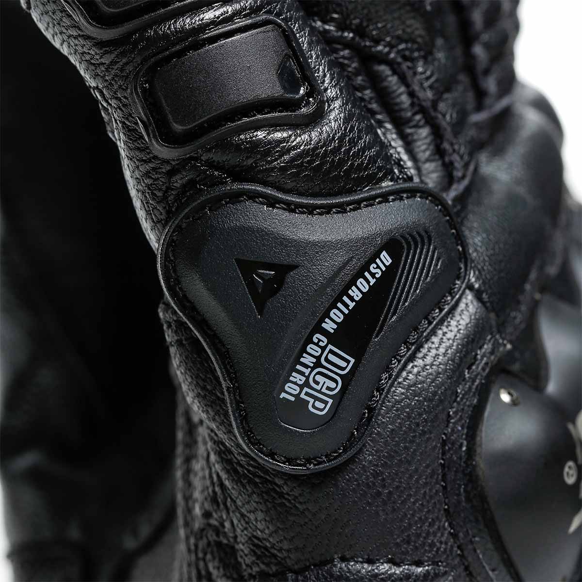 The 4 Stroke Glove features composite stainless steel, TPR inserts, external little finger reinforcements, thermoplastic resin inserts, and Dainese's Distortion Control System, which provides increased mobility and protection on the wrist, knuckle, and side of the finger.