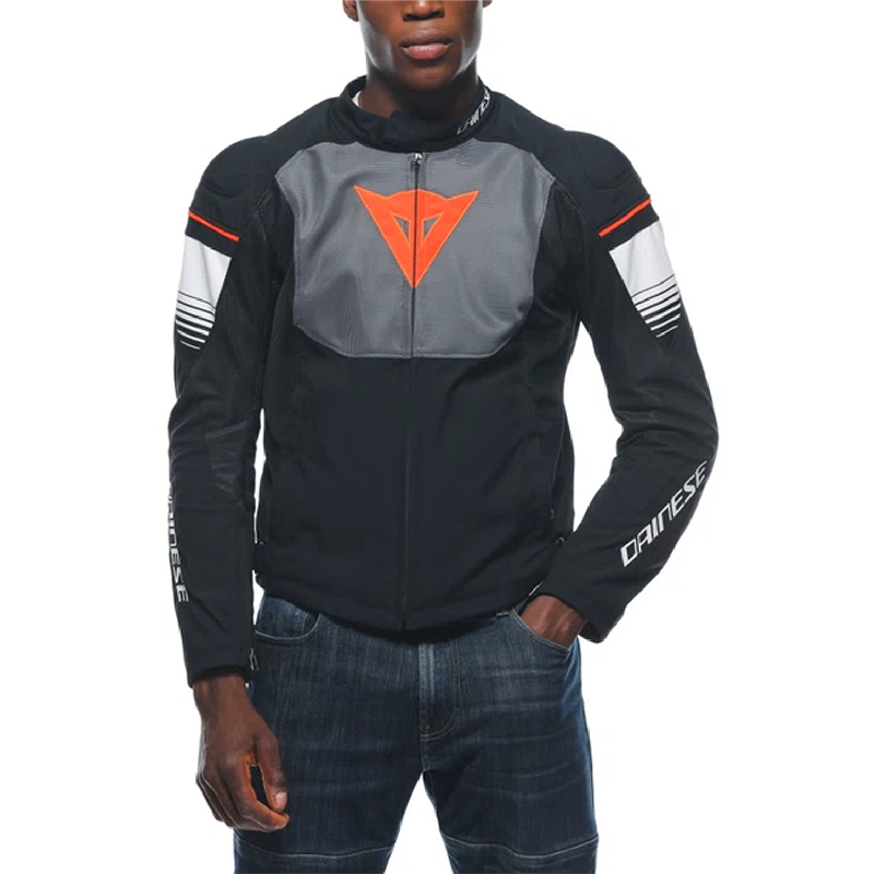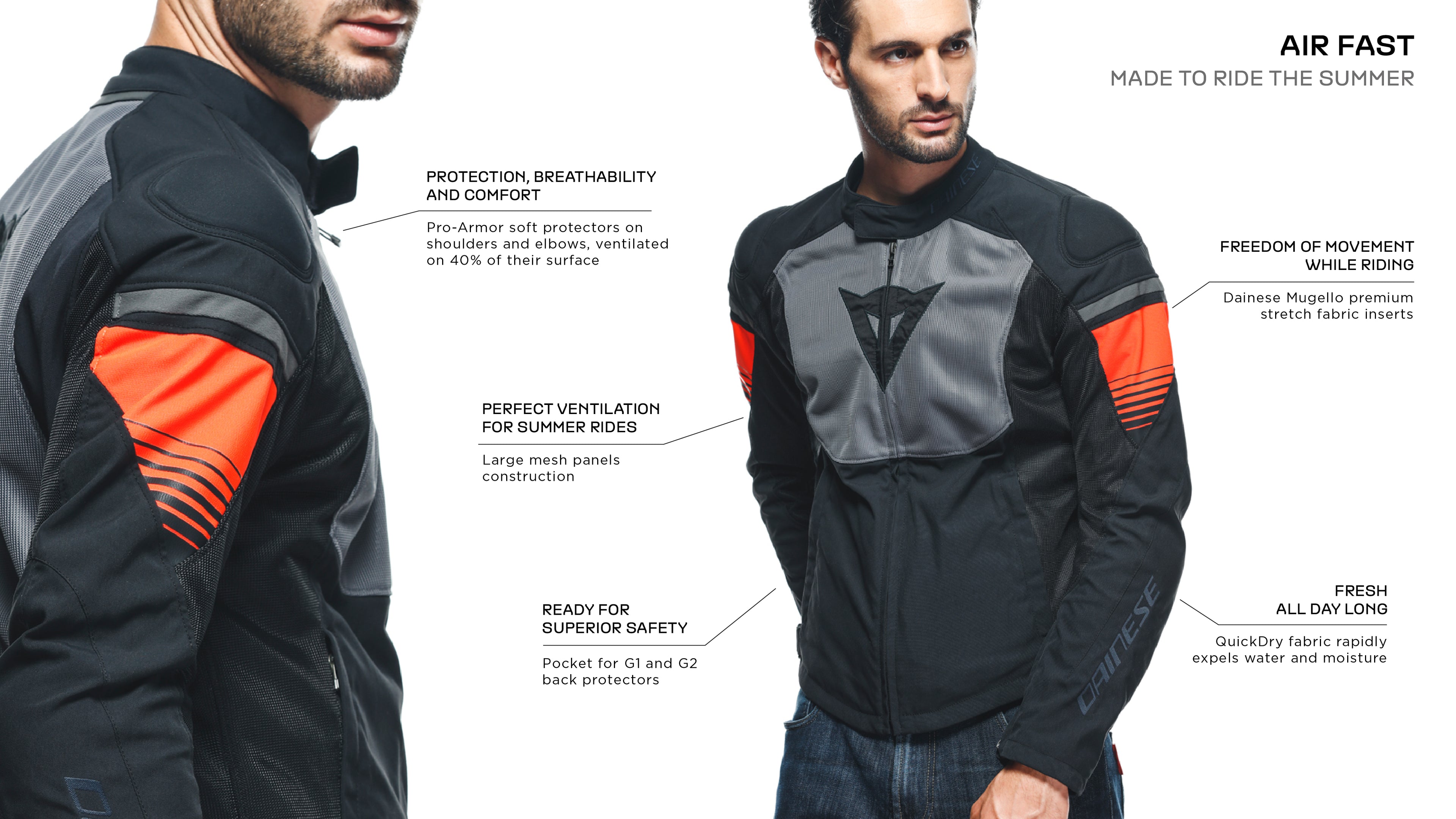 The Air Fast Tex is a sporty light summer motorcycle jacket designed to offer optimal ventilation on hot days due to its mix of QuickDry fabric materials and large air mesh panels, which are combined with breathable lining.
