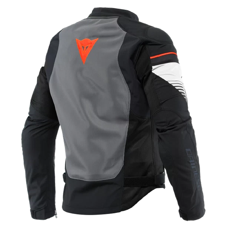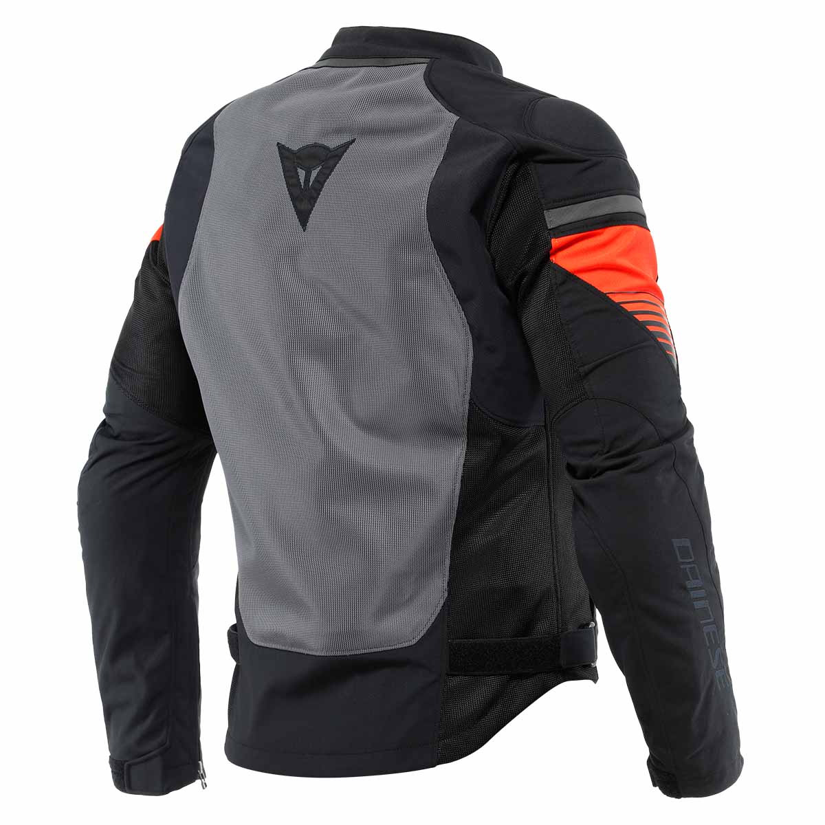 The Dainese Air Fast Tex motorcycle jacket guarantees proper ergonomics due to its stretch fabric inserts on the back, the adjustable Velcro waist, and jacket/pants connection system.