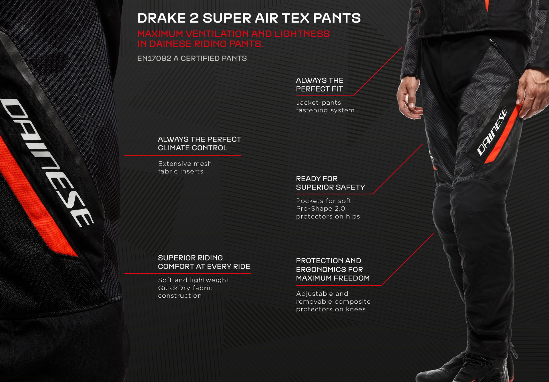 Designed to enhance ergonomics and freedom of movement while riding, these pants also maintain Dainese’s high safety standards: Boasting EN 17092 class A certification, they feature removable composite protectors as well as side pockets designed to accommodate Pro-Shape soft protectors.