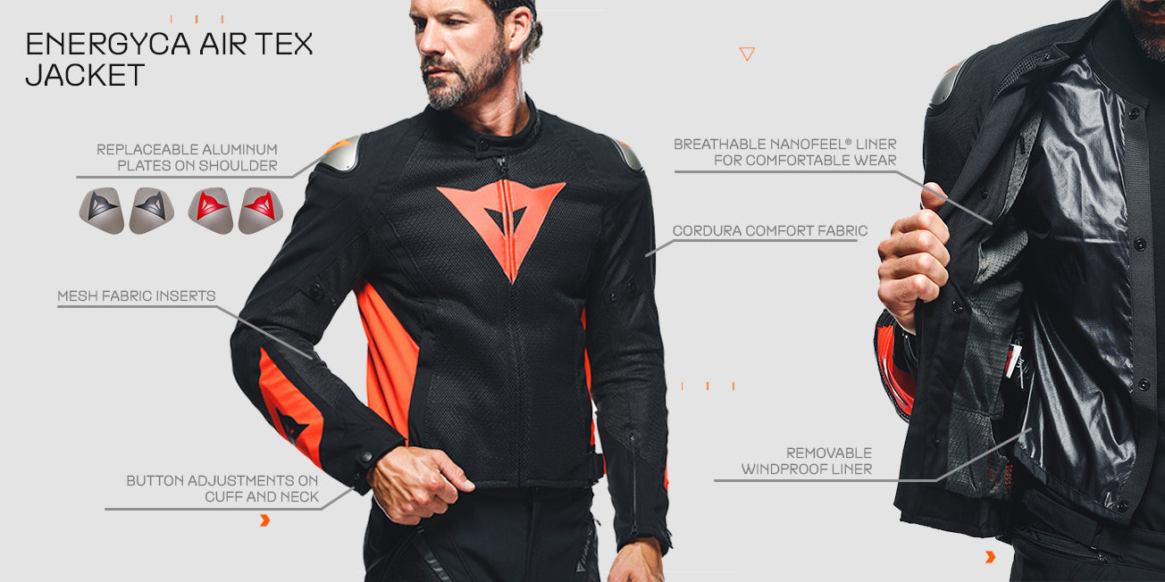 The Energyca Air Tex motorcycle jacket is designed for short and medium-haul travel during the warm season and to offer highly ergonomic freedom of movement, hugging the lines of the body due to its Cordura Comfort stretch fabric construction, which is highly resistant to abrasions and works in synergy with the adjustable fit options at the collar, waist, sleeves, and cuffs, and with the jacket/pants connection system.