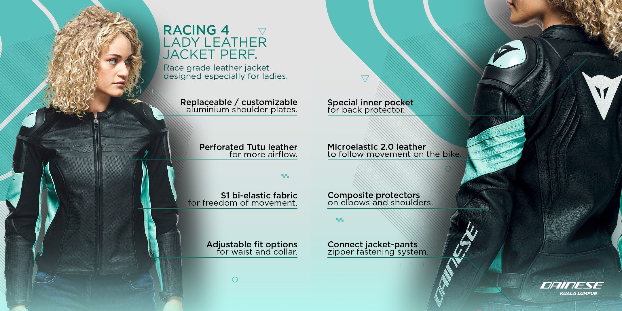 Racing 4 Lady is a women's leather motorcycle jacket designed for the female body to offer extreme comfort and versatility through a series of details, which includes S1 bi-elastic fabric and Microelastic 2.0 leather applied to a premium Tutu cowhide structure.