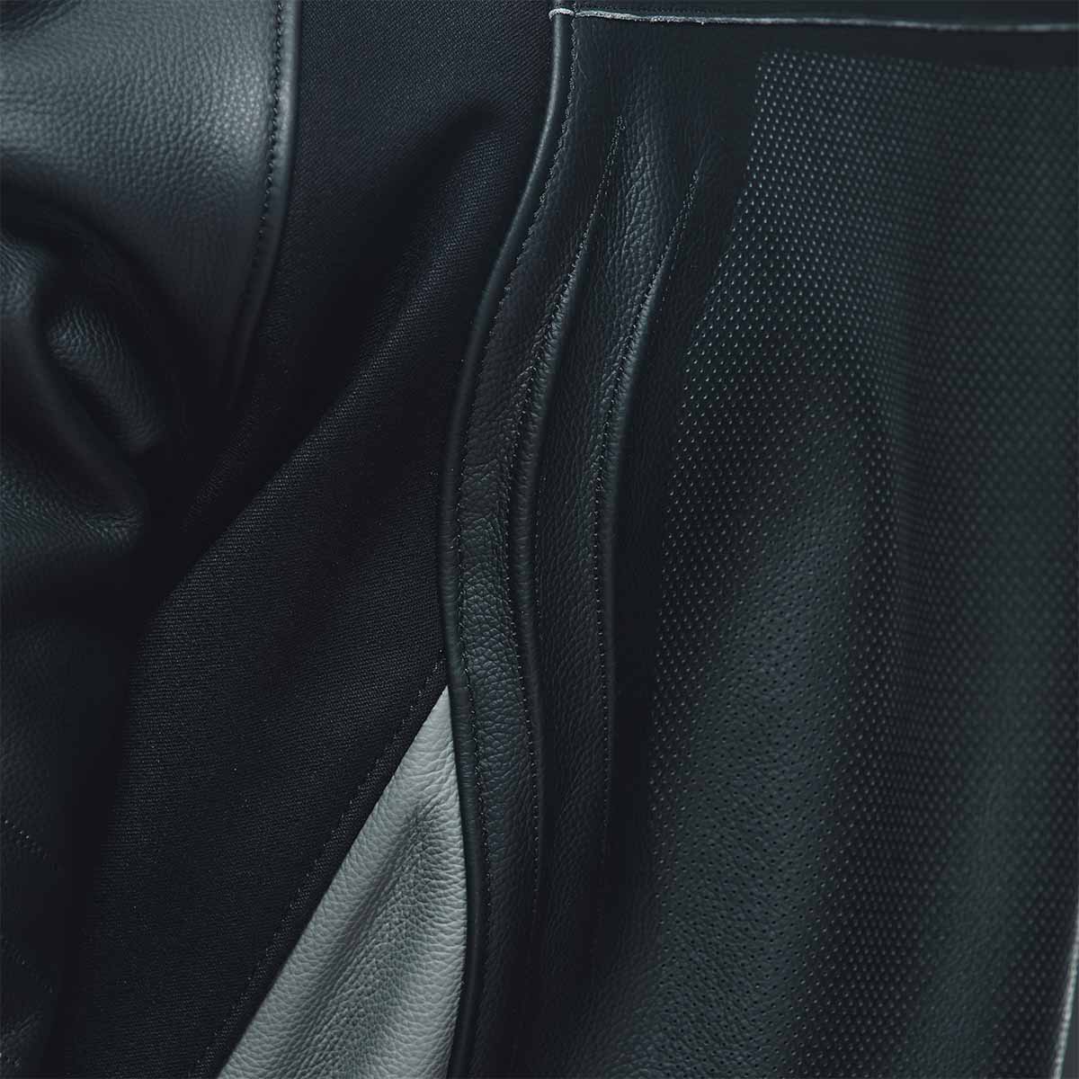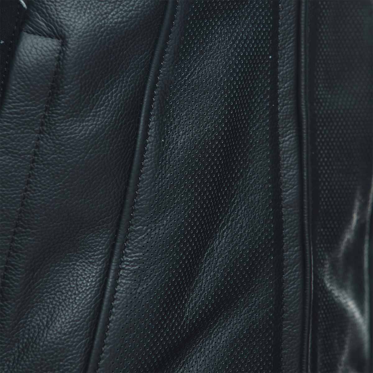 Made of premium Tutu cowhide with inner breathable lining, it is equipped with four air vents, two on the sides and two on the chest, to offer optimized temperature. A snug fit and flexibility are ensured by a fit adjustment system at the hips, the S1 bi-elastic fabric sections, and the Microelastic 2.0 leather inserts on the back and arms, which increase freedom of movement, while maintaining standard skin protection.
