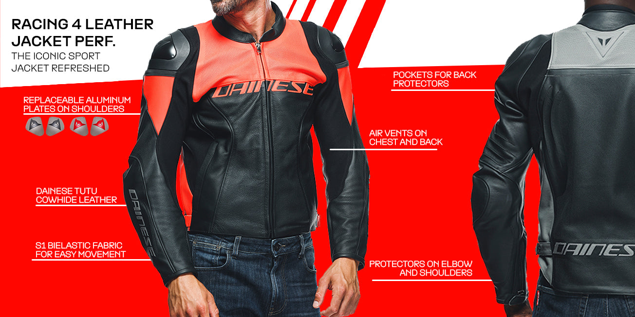 Racing 4 leather motorcycle jacket, an iconic piece of the Dainese collection, with an athletic and tight fit to take you through sports riding.