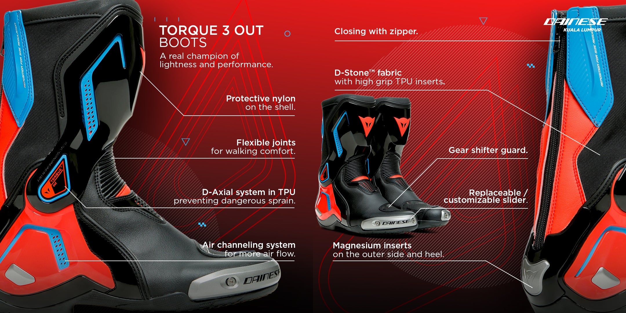 The Dainese Torque 3 Out is a racing boot made of microfibre and D-Stone fabric, with high grip TPU inserts.